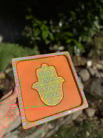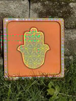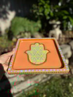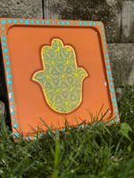 9x9in flower of life hamsa on wooden tray. Protected and coated with art resin.