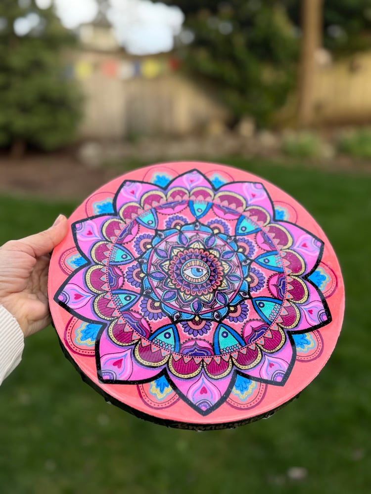10x10in freehand mandala on canvas. Protected and coated with art resin.